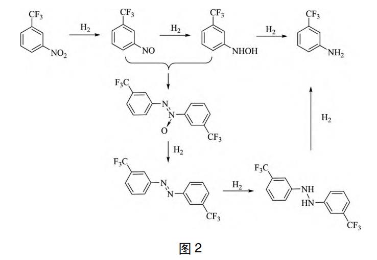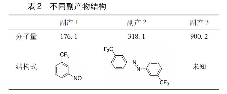 对连续运行的反应液进行液质分析发现,存在分子量分别为 176、318 及 900 的副产物,推测分子量为 176 的副产物为不wanquan加氢产生的亚硝基物,结构可能为间-亚硝基( 三氟甲基)苯; 分子量为 318 的副产物主要为偶氮化合物。