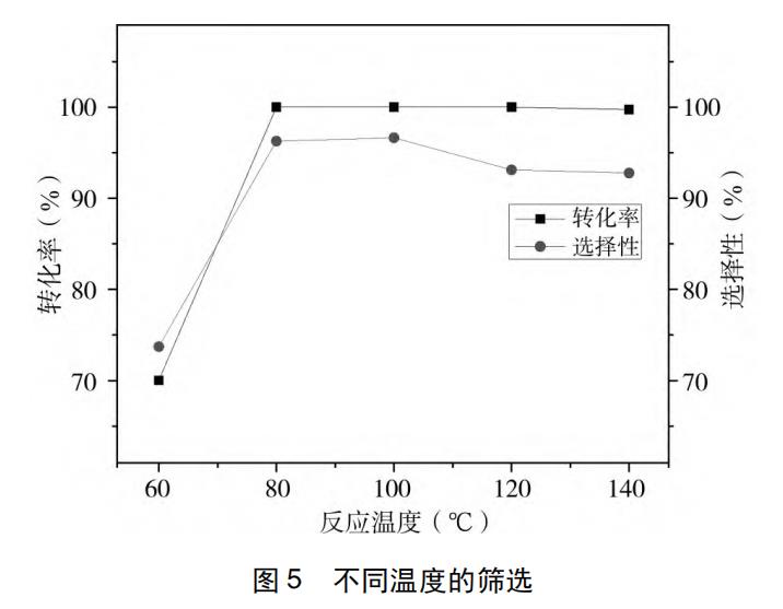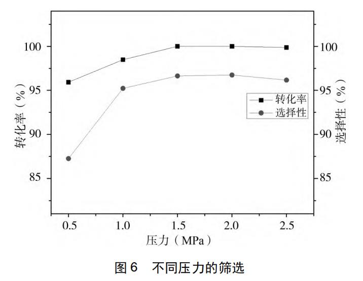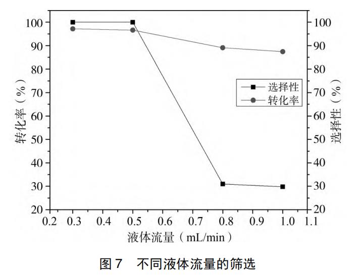 在溶剂研究中发现,甲醇和异丙醇反应的选择性和转化率较高,溶剂为异丙醇时反应存在少量原料 ( 0. 53%) 未转化,因此后续的条件筛选使用甲醇为溶剂。在温度研究中发现,60-100℃时,60 ~ 100 ℃ 升高温度能够提高转化率和选择性,当温度高于 100 ℃ 时反应选择性下降。压力研究中发现,升高压力会提高反应的转化率和选择性,当压力达到 1. 5 MPa 时,继续升压力所提升的反应效果并不明显,可能由于反应液中加氢需要的氢气量已经足够。气液流量过低会导致反应效率较低,研发发现,当气体流量达到100 mL /min 时,转化率达到 100%;而液体流量保持在 0. 5 mL /min 是较优条件。