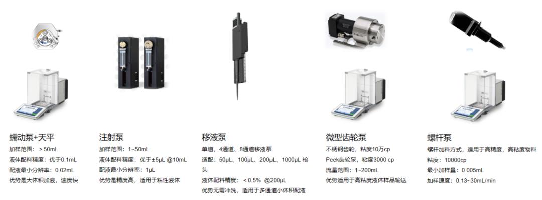 当然,除了负压加样外,针对不同的原料,我们还有不同的技术去匹配。在固体粉末称量方面除了负压加样外,还有多种规格固体料仓加料方式。而在液体样品配置方面,涵盖了蠕动泵+天平、注射泵、Tip移动器、齿轮泵+天平、螺杆泵+天平等多种方式。