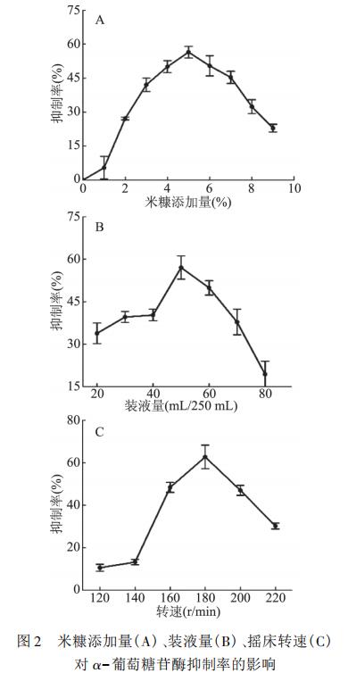 通过实验确定各影响因素条件为:培养时间 48h、温度 35℃、培养基初始 pH8.0、米糠添加量 5%、装液量 50mL/250mL、摇床转速 180r/min。实验发现糠在发酵中起到重要作用,当培养基中不添加米糠时,对α-葡萄糖苷酶活性没有抑制作用。